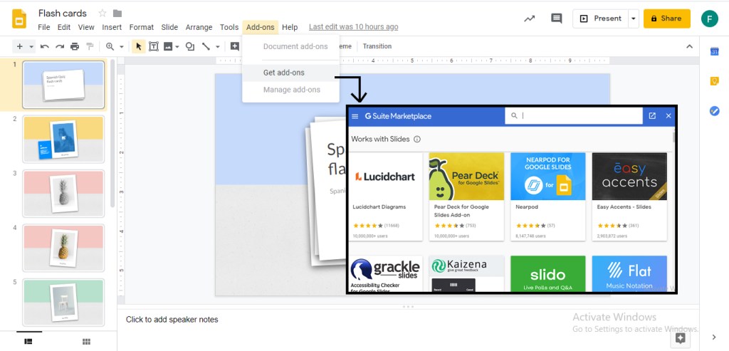 Fitur ini mempermudah pengguna untuk mempercantik slide presentasi, dengan fitur add-ons pengguna dapat membuat presentasi visual tanpa perlu meninggalkan google slide.