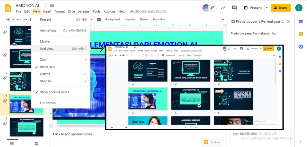 Fitur ini mempermudah untuk melakukan pengubahan pada slide, karena dengan memilih grid view, semua slide akan terlihat dalam satu thumbnails.