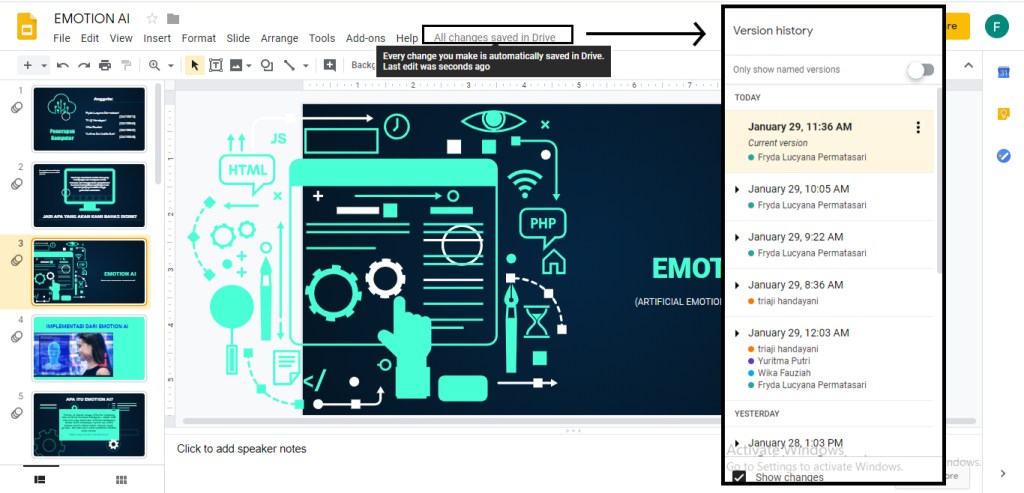 Google slide memiliki fitur untuk menyimpan riwayat pengeditan, sehingga pengguna dapat melihat riwayat pengeditan berkas presentasi serta mengembalikan pengeditan versi lama.
