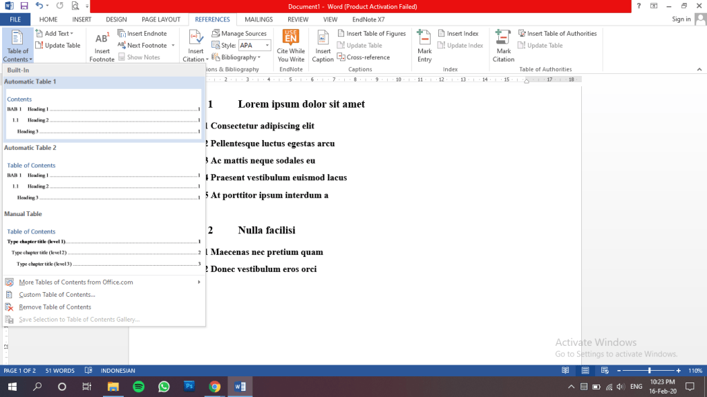 Untuk membuat daftar isi, kita akan menggunakan pilihan pada menu toolbar references. Kemudian pilih table of contents > klik salah satu pilihan pada table of contents.