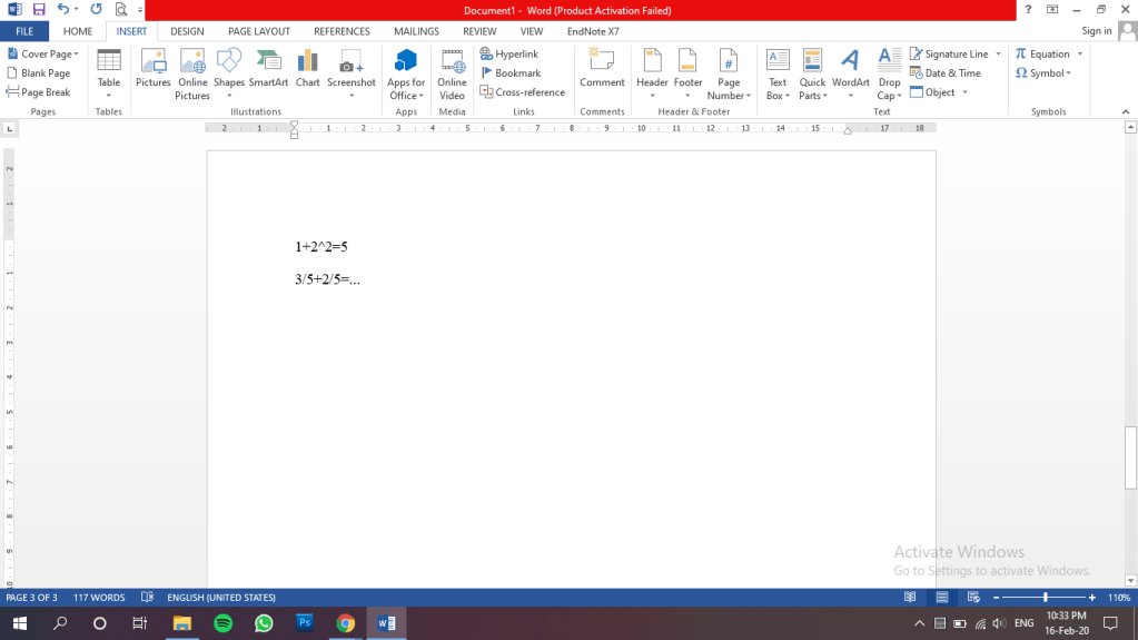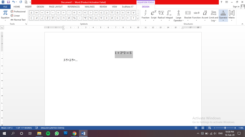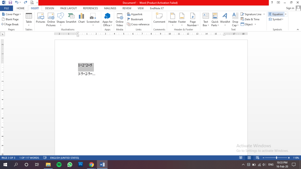 Pertama, adalah dengan blok baris angka yang akan kalian ubah menjadi bahasa matematika. Kemudian pilih equation pada menu insert, dan akan terlihat hasilnya seperti pada gambar di bawah.