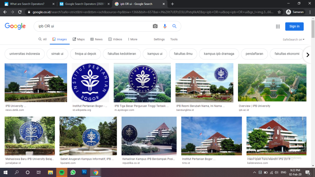 Contoh yang saya gunakan adalah untuk mencari IPB OR UI pada google images, dan dapat dilihat hasilnya seperti berikut.