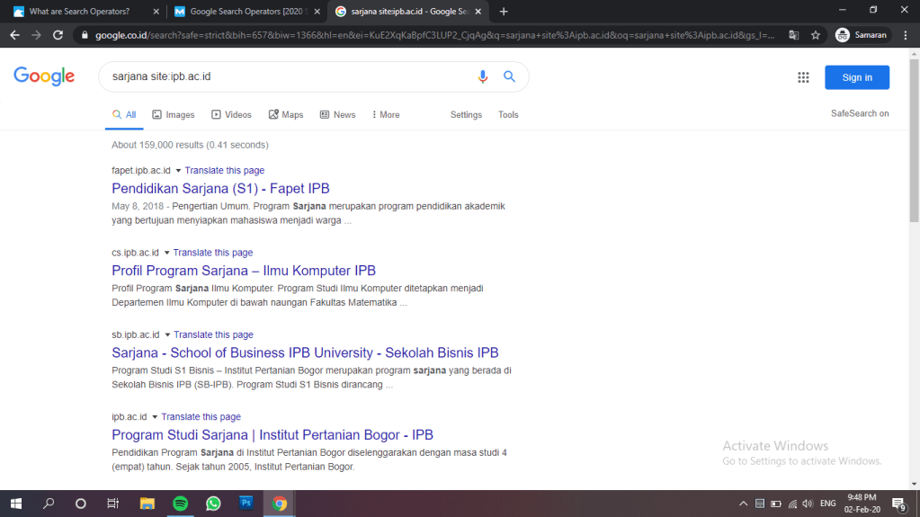 Contoh yang saya gunakan adalah dengan mengetikkan sarjana site:ipb.ac.id pada google search, dan dapat dilihat hasilnya seperti berikut.
