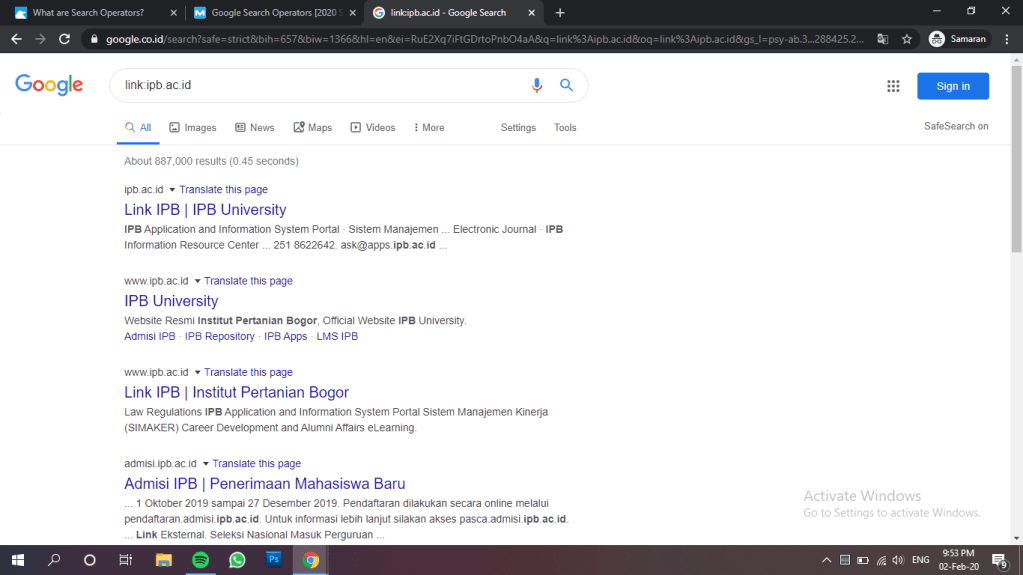Contoh yang saya gunakan adalah dengan mengetik link:ipb.ac.id, dan hasilnya dapat dilihat seperti berikut.