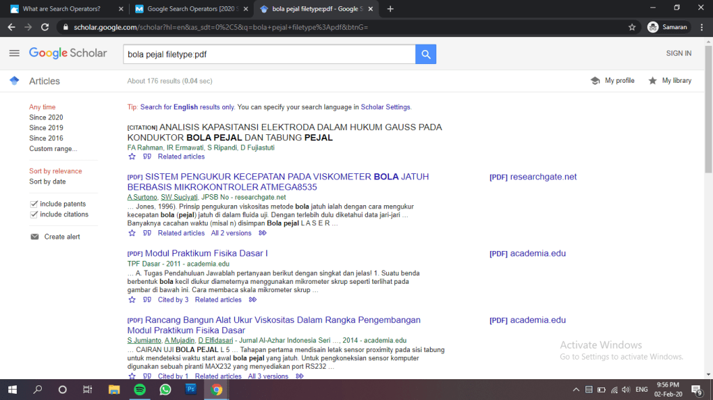Sebagai contoh, saya menggunakan perintah kata ini pada google scholar untuk menemukan filetype pdf yang memuat kata yang saya inginkan.