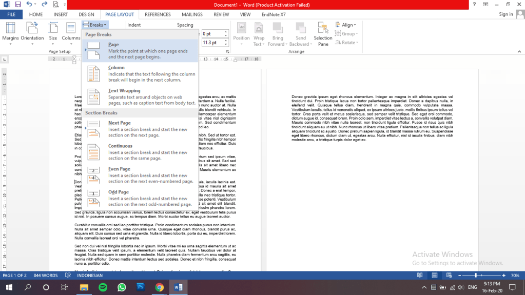 Kemudian kita akan menggunakan submenu breaks > page untuk memisahkan suatu paragraf yang kita inginkan dengan paragraf lain sebelumnya, hasilnya akan terlihat seperti di bawah.