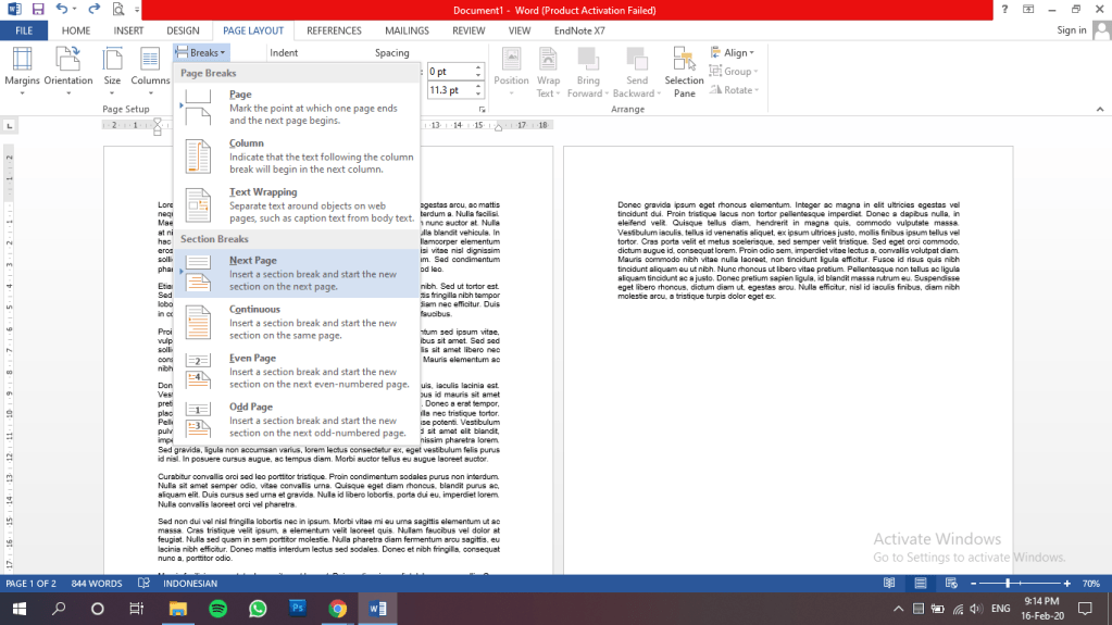 Nah, kita mulai dengan cara membuat section break dan page break.