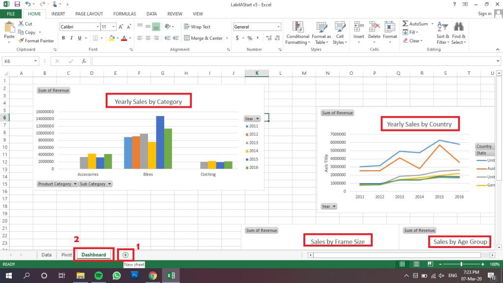 2. Tambahkan sheet baru dengan mengikuti langkah di bawah, dan namakan sheet baru tersebut dengan nama Dashboard. Pindahkan diagram-diagram ke sheet Dashboard kemudian beri judul.