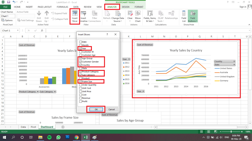 3. Klik diagram yang diinginkan, kemudian pada menu analyze pilih insert slicer, lalu ceklis slicer yang diinginkan. Di sini saya memilih slicer year, age group, customer gender, country, product category, sub category, dan frame size.
