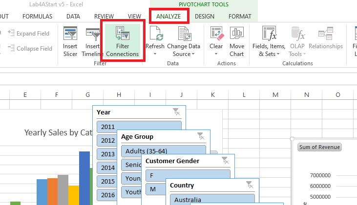 4. Setelah membuat slicer, untuk menghubungkan slicer dengan pivot chart bisa dilakukan langkah seperti gambar di bawah dengan klik filter connection pada pivotchart tools > analyze.