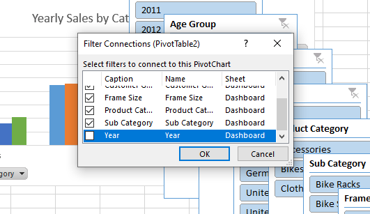 5. Kemudian pilih slicer yang ingin dihubungkan dengan pivot, klik OK.